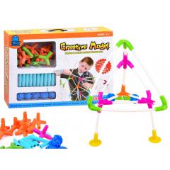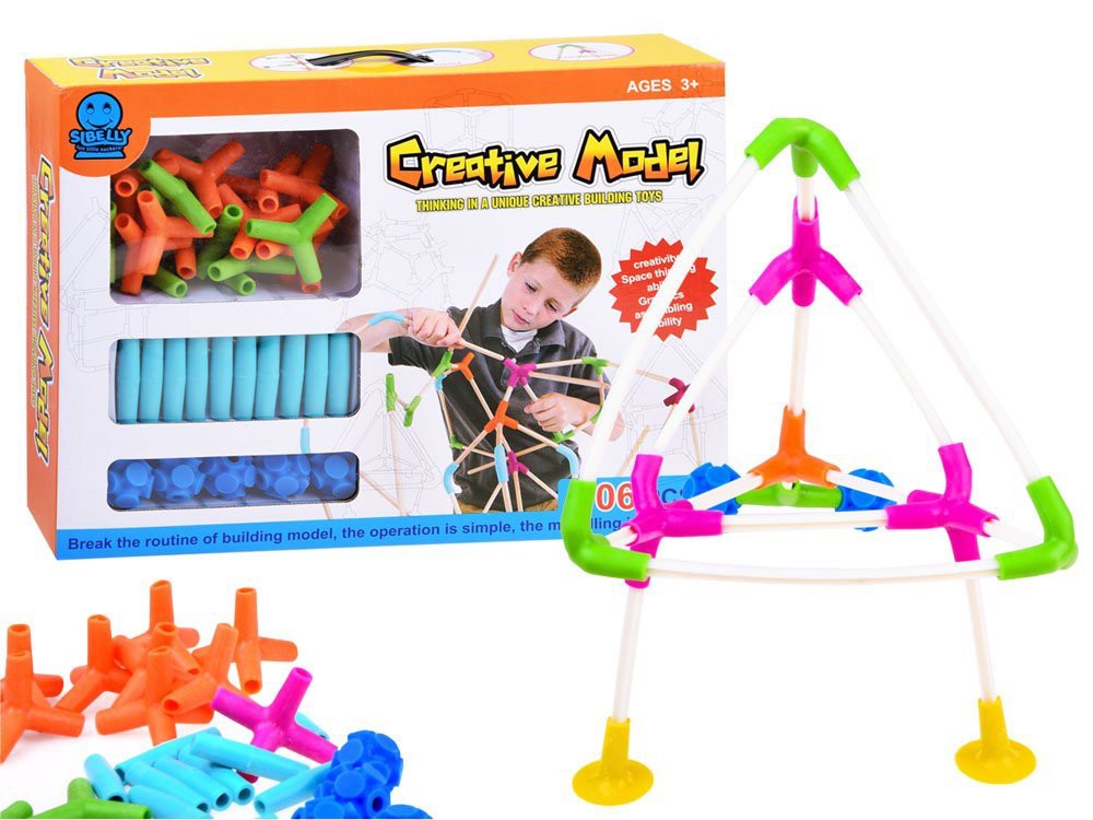 A különböző hosszúságú műanyag rudak, gumi csatlakozók és tapadókorongok lehetővé teszik, hogy térbeli szerkezeteket építsünk.