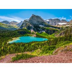 Fedezd fel az amerikai természet fenséges szépségét a Grinnell-tóval, a Glacier Nemzeti Parkban, az Amerikai Egyesült Államokban. Ez az egyedülálló készlet 3000 precízen kidolgozott darabból áll, amelyek összerakva egy lenyűgöző, 92 x 68 cm-es képet hoznak létre, amely egy festői hegyi tájat ábrázol egy türkizkék tóval a Glacier Nemzeti Park szívében.