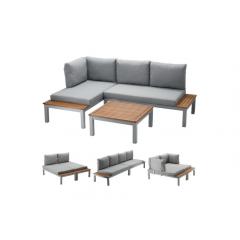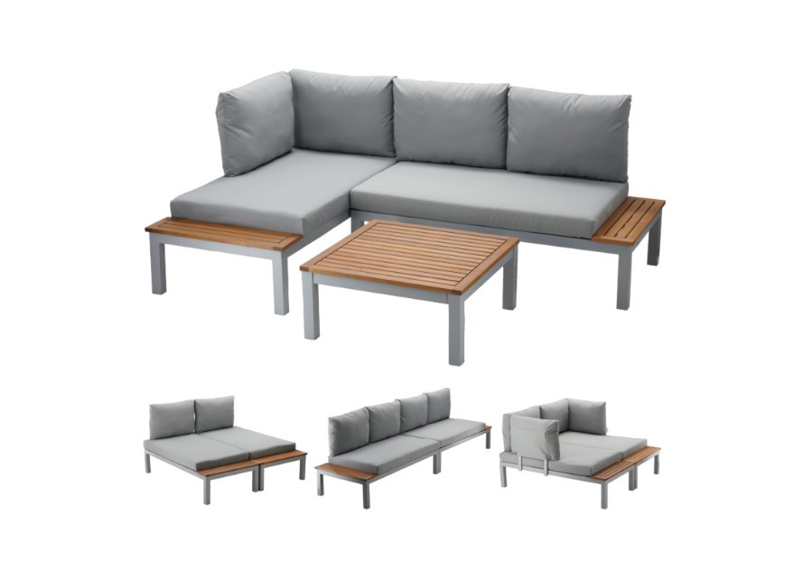 Ez a moduláris bútorgarnitúra modern és funkcionális megoldást kínál lakóterébe. A szett két moduláris kanapét és egy dohányzóasztalt tartalmaz. A bútor masszív alumínium vázra épül, a fa elemek pedig tartós eukaliptuszfából készültek.