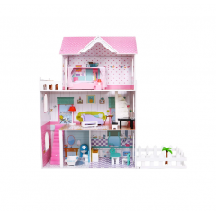 Mega nagy fa babaház felszereléssel és kerttel, 3 éves kortól ajánljuk. Igényesen elkészített, gazdagon felszerelt, gyermeke álma lesz. A tervezett ház kiváló minőségű fából, masszív és tartós anyagból készült, stabil és ellenáll a külső sérüléseknek. A faház és fa berendezési elemei biztonságos, nem mérgező festékekkel lettek lefestve. A ház és a felszerelés finom pasztell színei hihetetlen előnye ennek a készletnek. A ház sok éven át szolgálja majd gyermekeit. A házban való játék kreativitásra tanít, fejleszti a képzeletet, pozitívan hat gyermeke fejlődésére, ugyanakkor sok pozitív érzelmet és benyomást kelt.