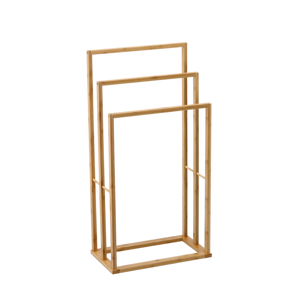 A bambusz törölközőtartó praktikus és helytakarékos megoldás a mindennapi használatra, amely rendezettséget és természetes eleganciát visz a fürdőszobába.
