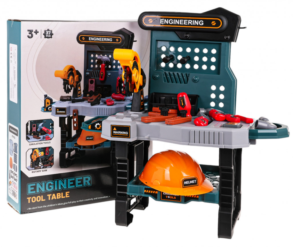 A jól felszerelt műhely sisakkal, körfűrésszel és kiegészítőkkel 3 éves kortól alkalmas.