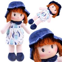 Egy bájos, puha rongybaba csodálatos kalapban valószínűleg minden lány legjobb barátja lehet. A baba teljes egészében puha, kellemes tapintású anyagból készült. Fején plüss sötétkék sapka, barna gyapjúhaja, hímzett rózsaszín mosolya az arcán és fekete szeme barna szempillákkal. A virágmotívumú bársonyruha színben passzol a babacipőhöz és a sapkához.