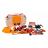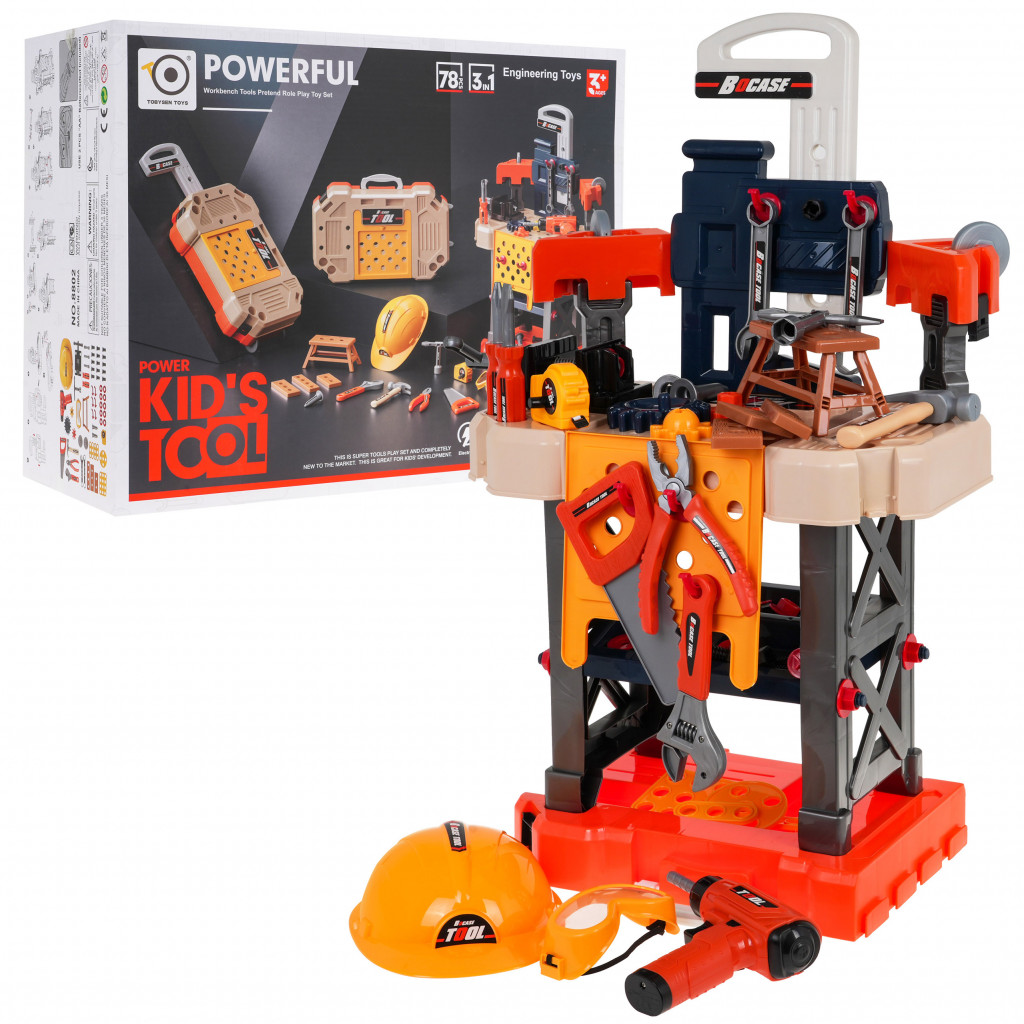 A készlet 78 elemet tartalmaz, mint például műhely alkatrészei, sisak, fűrész, csavarhúzók, akkumulátoros fúró, nagyszámú csavar stb.