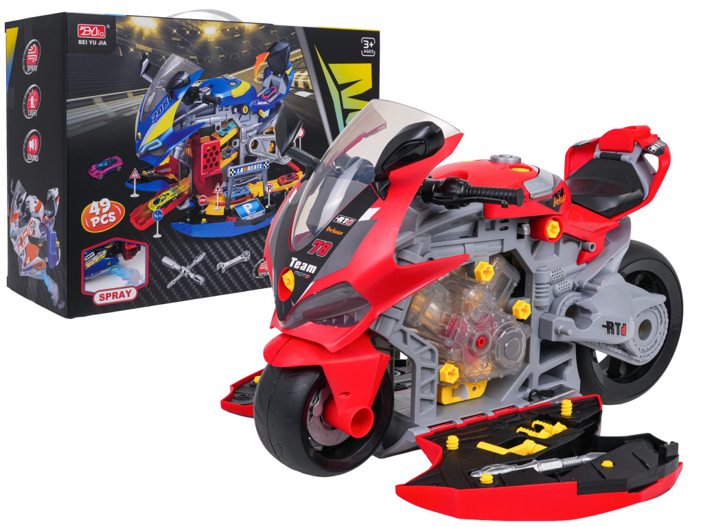 2 az 1-ben játék, egy nagy motorkerékpár műhellyel három éves kortól. A motorkerékpár világító fényszórókkal és hátsó lámpákkal rendelkezik. Indítási, vezetési és gyorsítási hangokat ad ki, és füst száll a kipufogócsőből (miután a tartályt vízzel feltöltötték). A motorkerékpár oldalai kinyithatók, így láthatóvá válik a megvilágított dugattyúkkal és járó hangokkal rendelkező motor. A motor levehető a motorkerékpárról, hogy felfedezhessük a mechanizmusát. A készlet tartalmaz egy szétszereléshez szükséges szerszámkészletet és egy vízadagolót. A motorkerékpár praktikus hordozófogantyúval rendelkezik, és kiváló minőségű műanyagból készült, így gyönyörű megjelenésű. A játék 3 db AAA 1,5 V-os elemmel (nem tartozék), míg a motor 3 db AG13 elemmel (tartozék) működik.