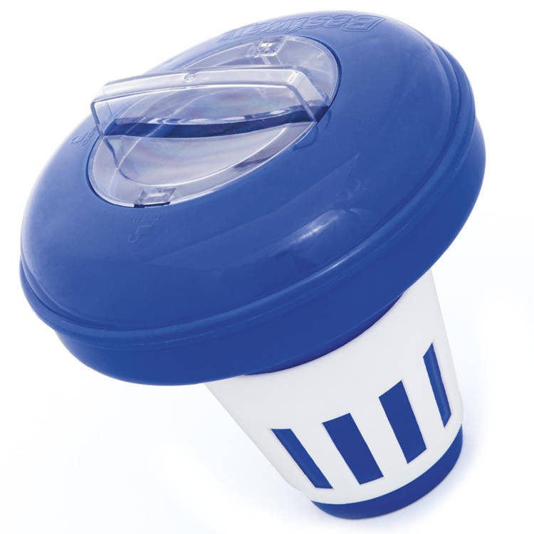 A medencevíz tisztítására szolgáló vegyszerek adagolását biztosító úszó tisztítószer adagoló. Lehetővé teszi, hogy a klór fokozatosan oldódjon fel a tablettákból, és így a víz fertőtlenítése egyenletes és folyamatos legyen.
