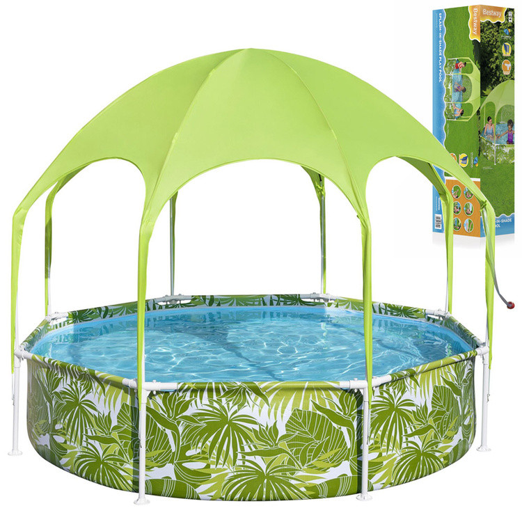 A 244 x 51 cm méretű és 1688 literes űrtartalmú Bestway SPLASH-IN-SHADE keretes gyermekmedence kényelmes hűtést biztosít a forró napokon, a kiegészítő tető pedig védelmet nyújt a napsugárzás (UV) ellen. A medence fémváza ellenáll az esőnek és a változó időjárási viszonyoknak. A ClickConnect™ csatlakozóknak köszönhetően a medence felállítása gyerekjáték, további szerszámok vagy tartozékok nélkül. A keretcsatlakozók megakadályozzák a fém fémmel való érintkezését, így biztosítva a rozsdaállóságot.