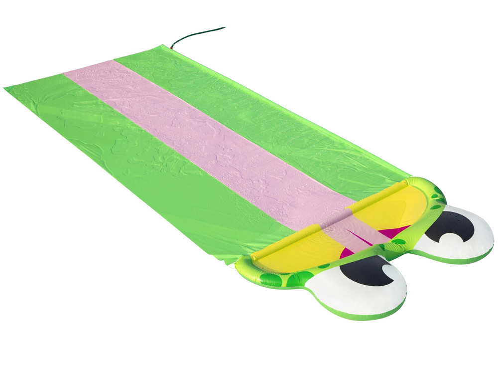 A csúszda széles, 488 cm hosszú hármas pályával rendelkezik, amely ideális versenyek rendezésére, a célegyenes végén egy örömteli béka képével. A pálya öntözése kerti tömlő csatlakoztatásával történik a csúszdában található zuhanyzókhoz. A csúszdába épített vízpermetezők biztosítják a maximális siklást, az áramló víz tisztán tartja a csúszdát, a vízsugarak pedig hűsítik a forró napokon. Az átgondolt kialakításnak köszönhetően a felfújható célegyenes végén összegyűlik az átfolyó víz, ezzel biztosítva a lágy fékezést nagy csobbanással! Az egész stabilabbá tétele érdekében a medence belső kamráját is feltöltheti vízzel. A csúszda előállításához felhasznált modern dizájn és strapabíró, bevizsgált anyag megkönnyíti és problémamentes működését. Csak bontsa ki a csúszdát, és versenyezzen egy szórakoztató versenyen.