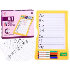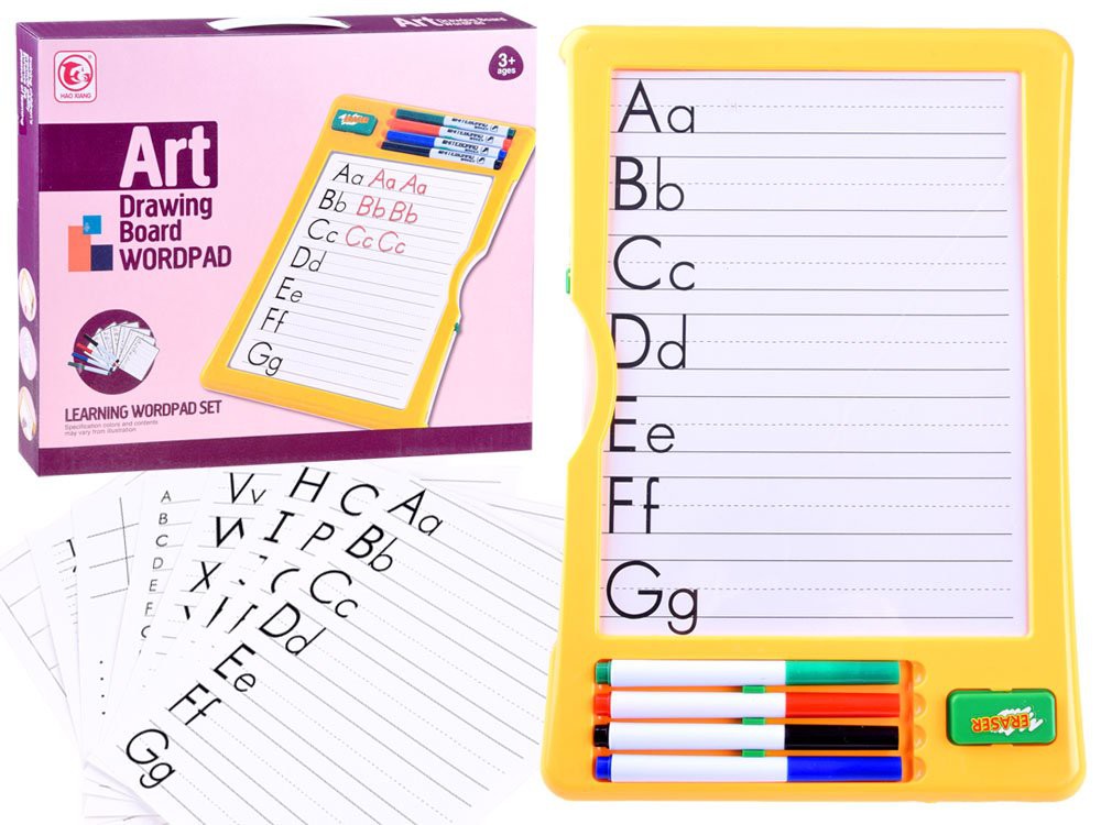 Javaslatunk van az írás megtanulásának egyszerű megtanulására száraz törlőlap formájában, kész betűkkel ellátott táblákkal.