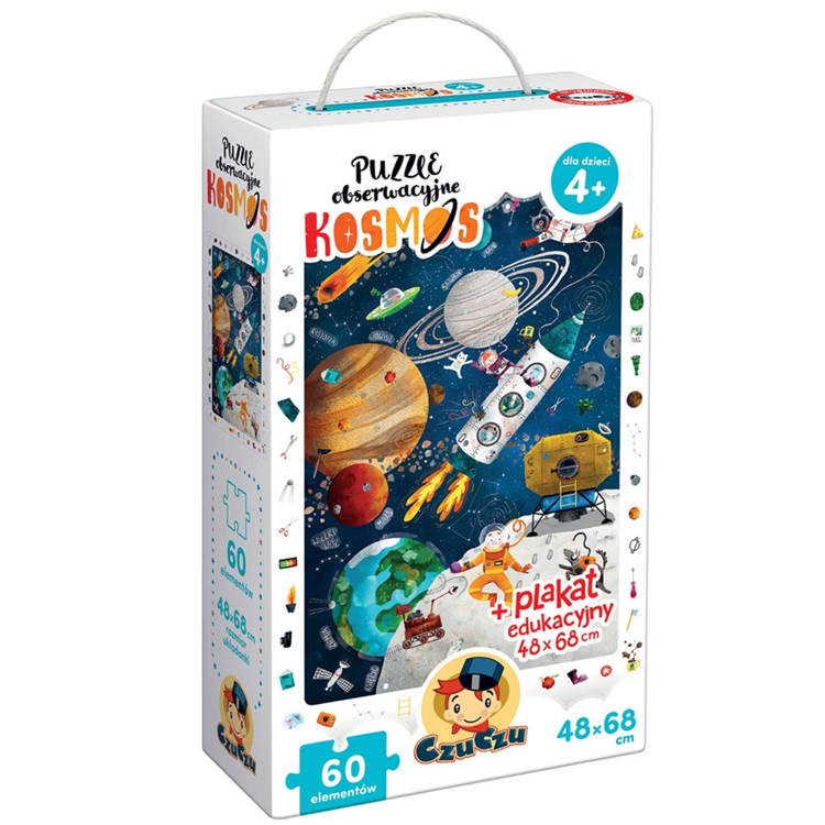 A móka nem ér véget a puzzle elrendezésével. A részletes illusztráció tökéletes a Naprendszer megfigyelésére. Felismered az összes bolygót? Tudod, hogy néz ki egy űrhajós, és ki az? A rejtvények számos lehetőséget kínálnak a gyerekekkel való beszélgetésre. A készlet tartalmaz egy oktató posztert, amely sok érdekes tényt tartalmaz a kozmoszról.