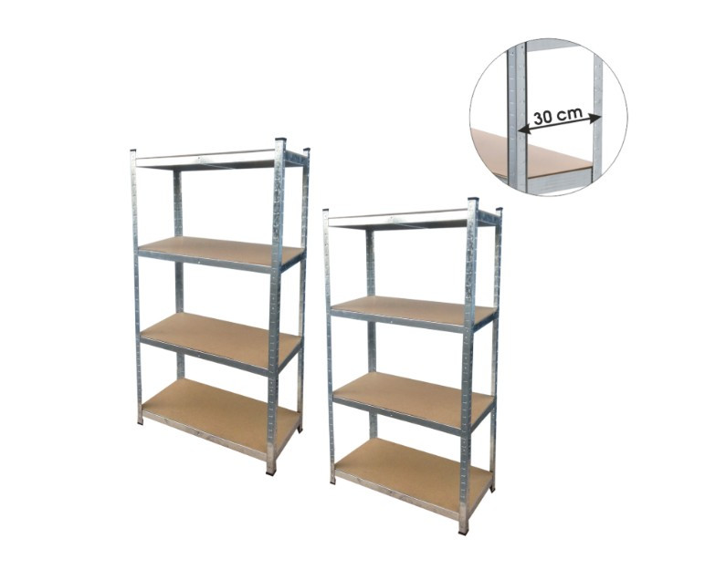 Ez a két négyszintes polcrendszer praktikus és robusztus megoldást kínál különféle tárgyak tárolására. Horganyzott fémprofilokból és MDF polcokból készültek , így stabilitást és tartósságot biztosítanak. A gyors és egyszerű összeszerelés megkönnyíti a használatot. Minden polc teherbírása akár 150 kg is lehet , így a polcrendszer funkcionális és tartós.