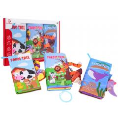 Puha érzékszervi könyvek készlet babáknak hat hónapos kortól. A legkiválóbb minőségű, bababarát anyagokból készült, a készlet susogó, puha tapintású lapokat tartalmaz, amelyek több szinten stimulálják a baba érzékszerveit. Az élénk színek vonzzák a baba figyelmét és ösztönzik a tanulságos játékot. A puha oldalakon számos állat illusztrációja látható. Az első könyv erdei állatokat, a második haszonállatokat, a harmadik pedig különféle tengeri élőlényeket ábrázol. Minden állat angol felirattal van ellátva. Minden oldalból különböző anyagokból készült farkak állnak ki. A könyvek vízállóak és könnyen tisztíthatók.