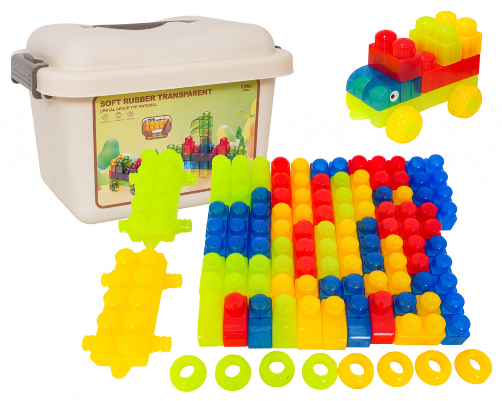 82 darabos puha gél kockás készlet hordtáskában 12 hónapos kortól. Puha, átlátszó TPE anyagból készültek, könnyen összeszerelhetők és különféle szerkezetek létrehozására használhatók. A fogantyúval ellátott hordtáska megkönnyíti a készlet tárolását és szállítását.