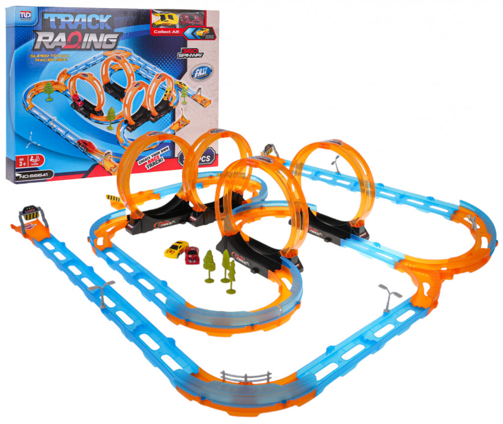 A pálya a legjobb minőségű műanyagból készült, élénk színekben. A készlet 59 elemből áll az önszereléshez. A pálya egyenes szakaszokkal rendelkezik a jármű gyorsításához, 4 360 fokos hurokkal és két járművel. A járműveket visszahúzó hajtás hajtja. Csak finoman tolja hátra a járművet, és teljes erővel átfut a pályán.