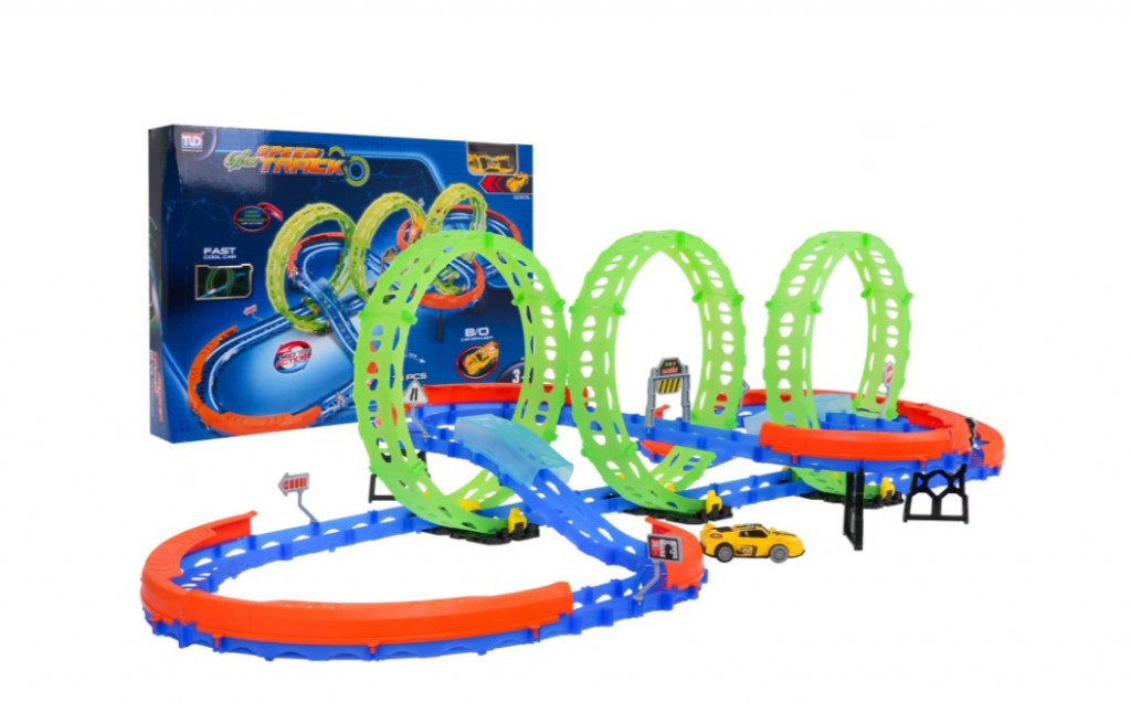A nagy, extrém versenypálya éles kanyarokkal, hurkokkal és autóval 3 éves kortól alkalmas gyermekek számára. A készlet 74 elemből áll. A pálya egyenes szakaszokat, éles kanyarokat tartalmaz korlátokkal, amelyek megakadályozzák a jármű leesését a pályáról, két szintet és három 360 fokos hurkot. A hurkok fluoreszkálóak és világítanak a sötétben. Az autó 2 x AA 1,5 V-os elemmel működik, az elemeket nem tartalmazza.