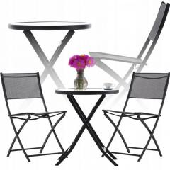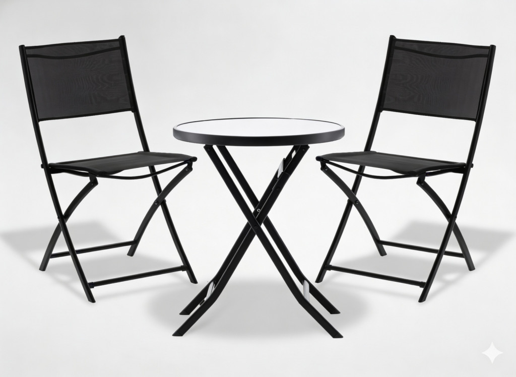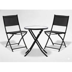 Erkélybútor-garnitúra, asztal + 2 összecsukható szék, fekete fém és üveg
