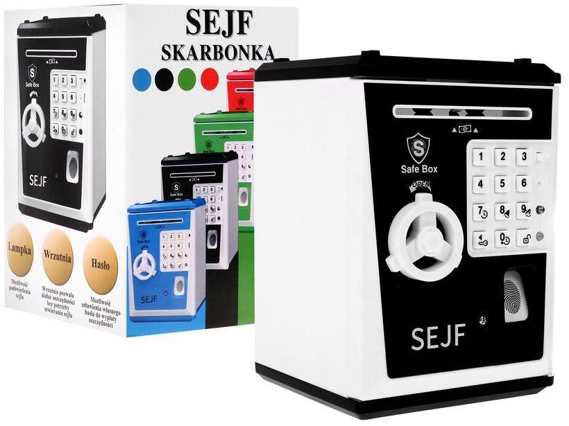 Készlet tartalma egy nagy pénzszekrény, széf alakú, 3 AA 3 x 1,5 V-os elemmel (nem tartozék).