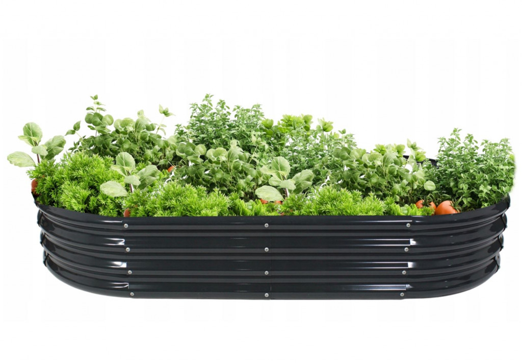 A 240 X 120 X 30 cm méretű, antracitból készült  ovális zöldség- és virágágyás  modern és esztétikus megoldás minden kisebb és nagyobb kertbe . Méreteinek köszönhetően sokféle növény termesztését teszi lehetővé, zöldségek és virágok egyaránt, miközben kényelmes munkavégzést és minden oldalról hozzáférhet a növényekhez. Könnyen telepíthető és karbantartható , biztosítva a művelés hatékonyságát és a kert dekoratív megjelenését.