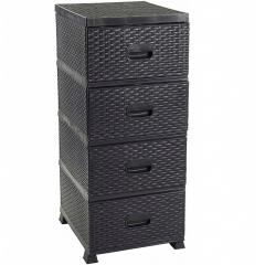 Fekete rattan hatású fiókos szekrény. 4 fiókot tartalmaz. Használata könnyü. Praktikus, minden tárgy elfér benne, igy sok helyet megtudunk spórolni a szobánkból. Tökéletesen lehet használni konyhába, fürdőszobába vagy folyosóra is. Rendkivül tágas és stabil lábakon áll. Divatos rattan mintával rendelkezik. Könnyen összeszerelhető, a pontos összeszerelési útmutató a termékhez csatolva megtalálható.