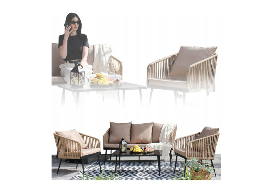 Teremtsen kényelmes pihenőhelyet kertjében, teraszán vagy erkélyén ezzel a modern kerti bútorgarnitúrával. A szett tartalmaz egy kétszemélyes kanapét , két fotelt és egy edzett üveg asztalt .