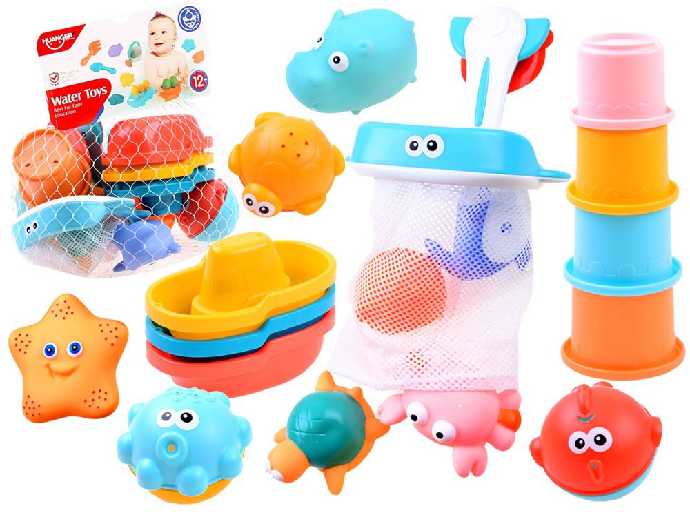 A játékok (kivéve a gumiállatokat) kiváló minőségű műanyagból készülnek. Az érdekes, intenzív színek vonzzák a figyelmet és szórakozásra ösztönzik gyermekét. A gumiállatokon lyukak vannak, aminek köszönhetően fel lehet tölteni vízzel, és ki lehet nyomni, mintha egy kis szökőkút lenne. A halászháló tapadókoronggal rendelkezik, melynek köszönhetően fürdés után a játékokat tárolhatjuk benne. A halászháló fogantyúval rendelkezik, amely állítható - fürdés közben is lehet kosárlabdát játszani.