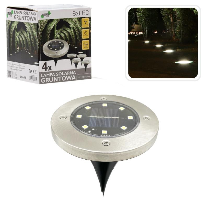 4 db beépíthető szolár lámpa készlet. Tökéletes a kertbe. Bármilyen helyre telepíthető, ahol elegendő napfény van. A napelemes lámpák akkor néznek ki a legjobban, ha utak mentén, sikátorokban, felhajtókon és teraszokon. Hangsúlyozzák és kiegészítik többek között a kertépítészetet. tavak vagy növényi kompozíciók. A lámpák napenergiával működnek.