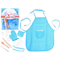 Gyermek konyhai készlet kék színben (kötény, szakács sapka, kesztyű, törlőruha, sodrófa, fakanál, habverő, sütőformák)
