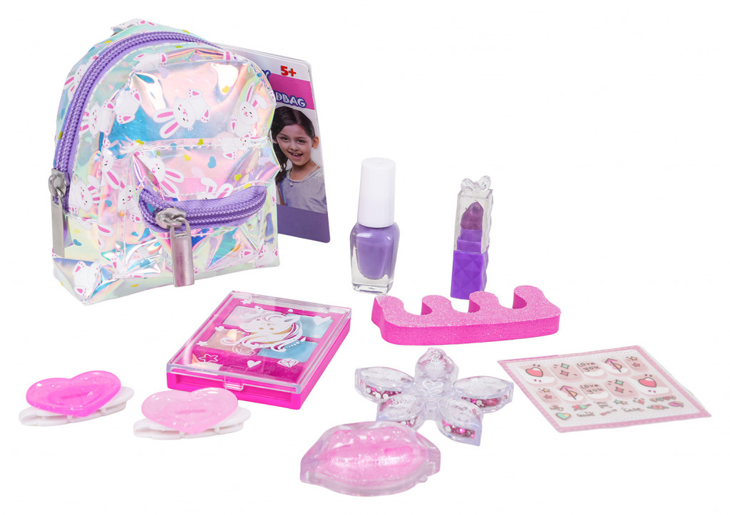 Kozmetikai készlet hátizsákkal öt éves kortól a divatos kis lányoknak. A hátizsákon kívül a készlet tartalmaz két hajcsatot, körömlakkot, rúzst, körömdíszítő applikációkat, körömmatricákat, lábujj-elválasztókat, szájfényt és szemhéjfestéket. A készlet a legmagasabb minőségű, gyermekbiztos anyagokból készült.