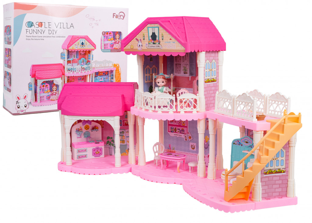 Egy gyönyörű, nagy, rózsaszín ház bútorokkal és egy babával a készletben, három éves kortól gyermekek számára. A ház három különálló modulból áll, amelyek bármilyen kombinációban elrendezhetők. A ház tartalmaz egy teljesen felszerelt nappalit, fürdőszobát, konyhát és gardróbot. A készlet kiváló minőségű műanyagból készült, élénk, szemet gyönyörködtető színekben.