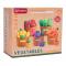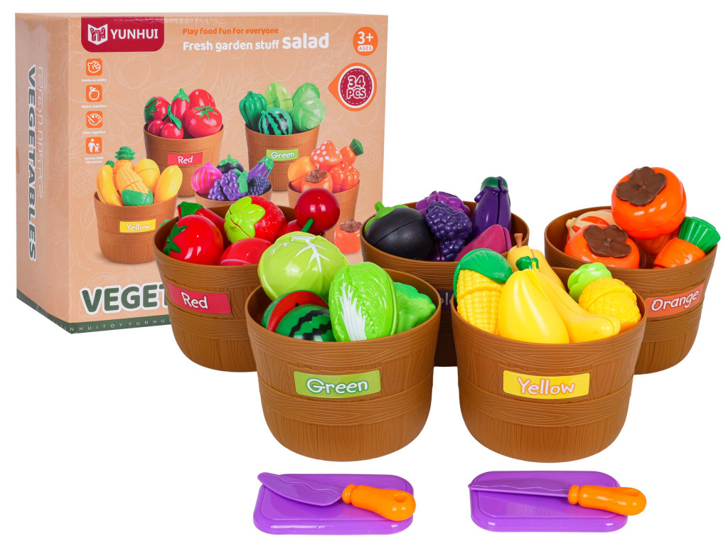 Színes, gazdagon felszerelt gyümölcs- és zöldségkészlet három éves kortól gyermekek számára. A készlet elemei kiváló minőségű műanyagból készültek, az élénk színek pedig vonzzák a gyerekek figyelmét. A készlet 34 darabot tartalmaz: zöldségeket, tépőzáras gyümölcsöket, gyümölcs- és zöldségválogató kosarakat, késeket és vágódeszkákat.