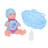 Imádnivaló játékbaba kék ruhában hordozóval, cumisüveggel