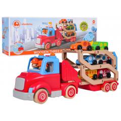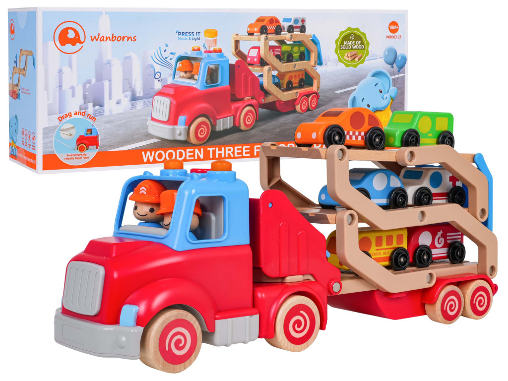 Ez a fából készült, interaktív, járművekkel ellátott vontatóautó tökéletes tizennyolc hónapos kortól a gyermekek számára. A játék a legmagasabb minőségű anyagokból készült: műanyagból és fából. Az élénk színek megragadják a gyerekek figyelmét és játékra ösztönzik. A vontatóautó leválasztható a járműről, vagy kihajtható, hogy pályát alakítson ki az autóknak. A készlet hat fa járművet tartalmaz: egy rendőrautót, egy taxit, egy tűzoltóautót, egy mentőautót, egy buszt és egy szállító furgont. A jármű tetején található gomb hangokat generál, például a teherautó indítása, dudálás vagy dallam lejátszása. A hangeffektusokat villogó fények kísérik. A teherautó elején található hurok lehetővé teszi, hogy egy zsinórt rögzíts a játékhoz. A játék 3 db AG13 elemmel működik (tartozék).