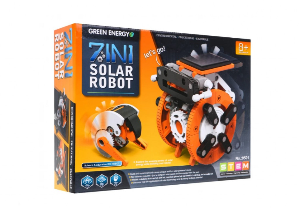 7 különböző napelemes építőipari járművet építhetsz. A kézikönyv lépésről lépésre tartalmaz utasításokat az egyes robotok felépítéséhez. A készletben van egy napelem, amely a napenergiát egy villanymotorba gyűjti, amely fogaskerekeket hajt meg, hogy a jármű mozgásban maradjon.