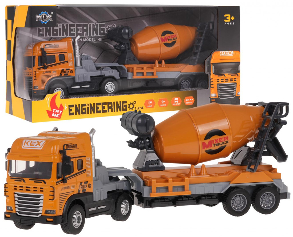 Interaktív betonkeverő gyerekeknek 3 éves kortól. A betonkeverő 1:24 méretarányban készült, fém, strapabíró kabinnal és a legjobb minőségű műanyagból készült forgó pótkocsival rendelkezik. Az utánfutó levehető, a beton körte mozgatható. A jármű villogó fényszórókkal és hangfunkciókkal rendelkezik: járművezetési hang, kürt, tolatóhang. A jármű kerekei gumi futófelülettel és hátsókerék-hajtással rendelkeznek. A játék 3 x AG3 elemmel működik (tartozék).