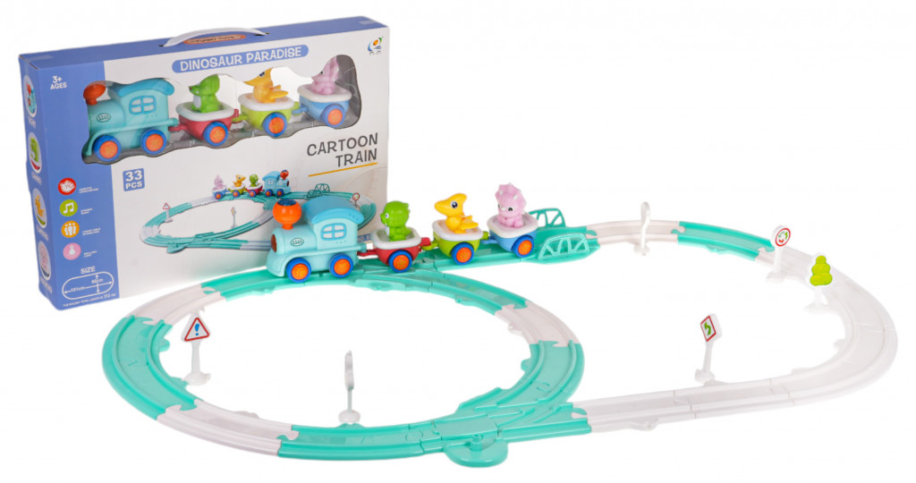 A vonat mulatságos hangokat ad ki, és fényekkel villog, miközben a síneken halad. Minden kocsi levehető, és minden dinoszaurusz eltávolítható a kocsiból. A készlet útjelző táblákat is tartalmaz.