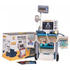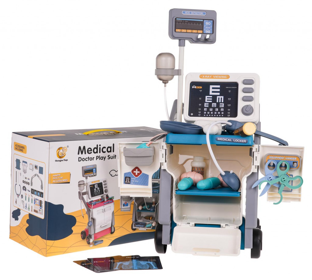 Interaktív, teljesen felszerelt orvosi készlet hang- és fényeffektekkel 3 éves kortól gyermekek számára. A készlet egy masszív felépítésű, könnyű, nagy kerekekkel és kényelmes fogantyúval ellátott kocsiból, valamint különféle orvosi eszközökből áll. A röntgenképek között válthat, a monitorozó képernyő pedig a gombok megnyomásával aktiválható a szívverés hangjai és riasztásai aktiválásához. A monitorozó panel 2 db AA 1,5 V-os elemmel működik (nem tartozék). A sztetoszkóp szívverés hangokat ad, a hőmérő pedig hőmérsékletmérési hangokat és háttérvilágítást biztosít. A sztetoszkópot és a hőmérőt összesen 3 db AG10 1,5 V-os elemmel működtetik (tartozék).