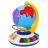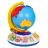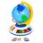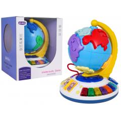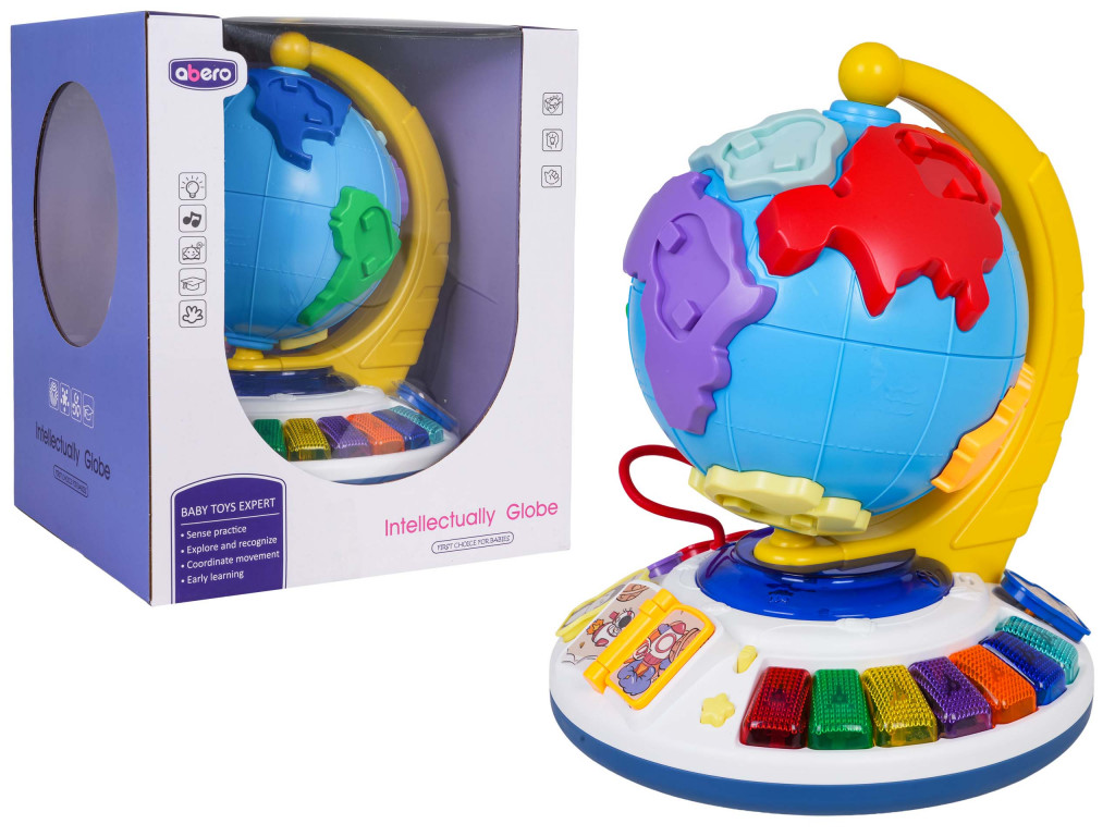 Interaktív földgömb hang- és fényfunkciókkal tizennyolc hónapos kortól gyermekek számára. Ez az oktatójáték a legkiválóbb minőségű anyagokból készült, élénk színekben. A földgömb rész kiemelt elemeket tartalmaz, amelyek kontinenseket utánoznak. Minden kontinensen található egy mélyedés egy kitűző számára, amelyen az adott kontinensen élő állat látható. A készlet hét kontinenst és hét állatos kitűzőt tartalmaz. A földgömb 360 fokban elforgatható a rögzített alapja körül. A földgömb alatt egy masszív alap található, mélyedésekkel az állatokat (ugyanazokat, mint a kontinenseket) ábrázoló kitűzők számára, egy háttérvilágítású zongora színes billentyűkkel, egy lapozható könyv és egy gyöngyös lapozható kirakós. A földgömb tökéletes eszköz a kisgyermekek   földrajztudásának és megszerettetésének ösztönzésére. Játékon keresztül segít a gyerekeknek megismerni a kontinenseket és azok elhelyezkedését a földgömbön, valamint az állatokat, formákat és színeket. Emellett fejleszti a finommotoros készségeket, a tapintásérzéket, a kézügyességet, a kéz-szem koordinációt és a képzeletet. A játék 3 db AA 1,5 V-os elemmel működik (nem tartozék).