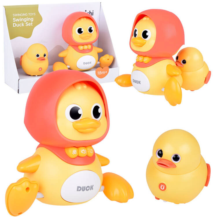 Az imádnivaló, zenélő kacsa tökéletes játék a kisgyermekek számára. A nagy kacsa vidám dallamokat produkál, amelyek minden bizonnyal játékra ösztönöznek. Ezenkívül a kacsa sík felületen mozog, ritmikusan egyik oldalról a másikra lendítve a zenére. A mulatságot a pocakján lámpa kíséri, mely megnyomásával kikapcsolható. A kacsa a hátulján található gombbal kapcsolható be. A játék lehetőséget kínál a zenével való lovaglásra vagy a dallam önálló lejátszására. Az elülső gombok lehetővé teszik a hangerő beállítását, a "hold" gomb pedig egy elnémított dallamot aktivál, amely ideális a gyermek elaltatására. A beépített mágnesnek köszönhetően a kacsák összekapcsolhatók, így egy bájos "vonat" alakítható ki.