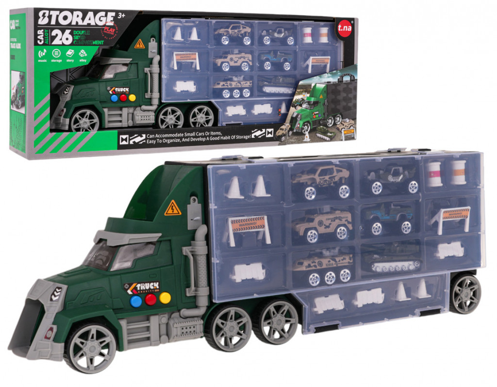 Interaktív katonai készlet, katonai teherautó hang- és fényeffektekkel, valamint kiegészítőkkel 3 éves kortól gyermekek számára. A teherautó számos titkot rejt, amit felfedezni kell. Az utánfutó oldalán nyitható rekeszek találhatók a készletben található kiegészítők számára. A kabin tetején egy csúszda található a készletben található katonai autók számára. A kocsit a kabin tetejébe helyezzük, és az kihajt a jármű elejéből. A teherautó kabinja világítással rendelkezik, az oldalán pedig hanggombok találhatók, amelyek megnyomása után a jármű indítási hangját, dudákat és egy vidám dallamot hallunk. A készlet olyan kiegészítőket tartalmaz, mint 6 db rugós katonai autó, 2 db hordó, 4 db kúp, 4 db kerítés, 2 db ütközőkorlát. A játék 3 db LR44 1,5 V-os elemmel működik (tartozék).