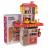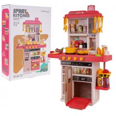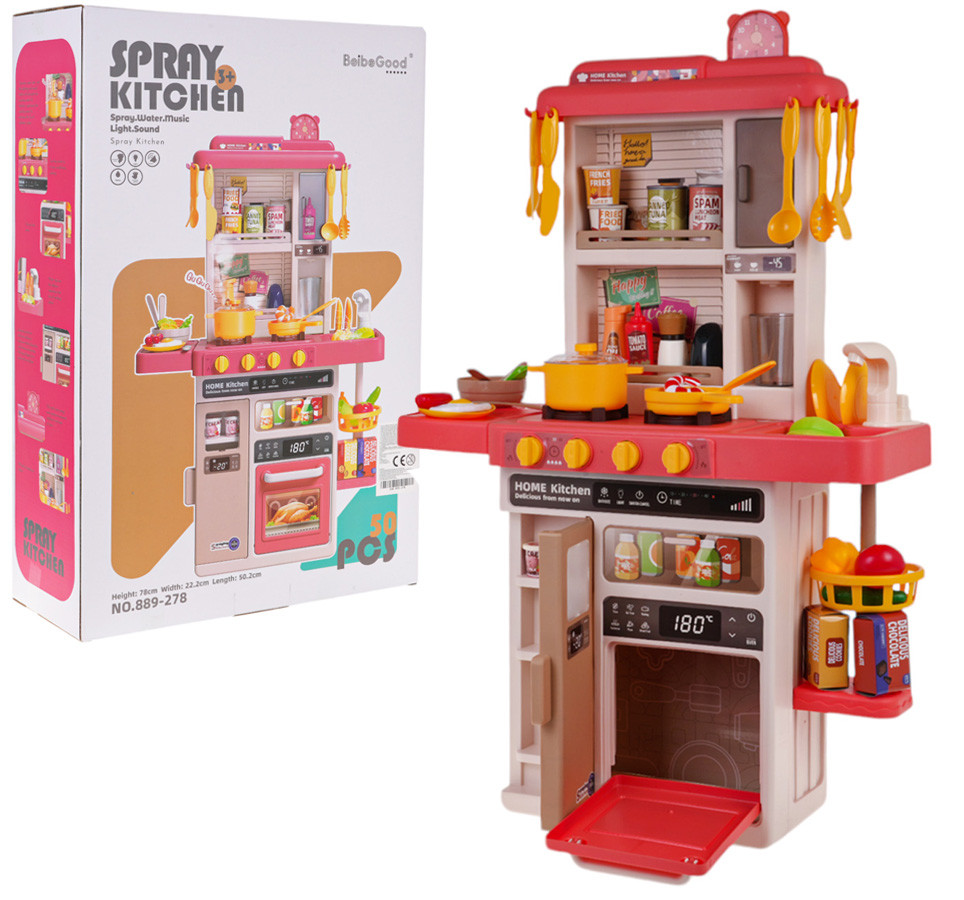 Interaktív konyha fénnyel, hanggal és vizet csöpögő csappal, valamint számos kiegészítővel, 3 éves kortól gyermekek számára. A konyha kiválóan készült, a legjobb minőségű műanyagból, és élénk színekben kapható, amelyek játékra ösztönzik a gyermeket. A konyhapulton egy interaktív tányér található égőfejekkel. Az egyik gomb elforgatása után főzési hangokat, a másik gomb sütési hangjait hallhatjuk. A főzés és sütés hangjait az égőfejek háttérvilágítása kíséri. Az egyik égőfejből biztonságos gőz távozik. A csapból valóban víz folyik, mint egy igazi mosogatóban, így a gyermek elmosogathatja a játék edényeket. A készlet tartalmaz egy nyitható ajtós hamis hűtőszekrényt, egy sütőt és rengeteg polcot, amelyekre hamis termékeket helyezhetünk. Az egész készlet nagyszerűen néz ki. A játék 3 db 1,5 V-os elemmel működik (nem tartozék).