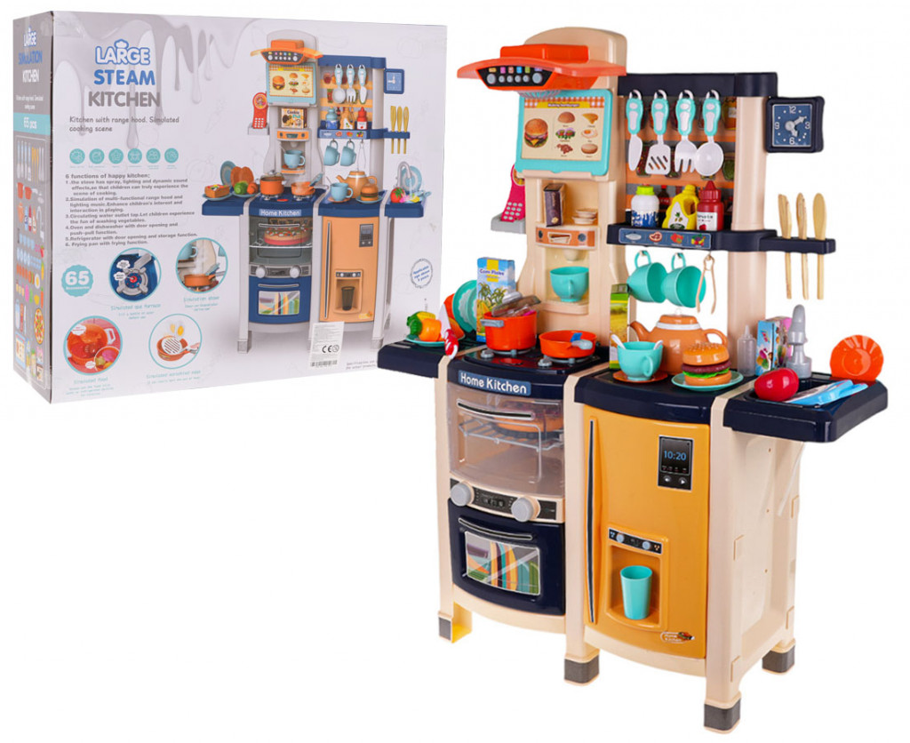 Interaktív konyha fénnyel, hanggal és vízcsappal, valamint számos kiegészítővel, 3 éves kortól gyermekek számára. A konyha kiválóan elkészített, a legjobb minőségű műanyagból, élénk színekkel, amelyek játékra ösztönzik a gyermeket. A konyhapulton egy interaktív tányér található égőfejekkel. Az egyik gomb elforgatása után főzési hangokat, a másik gomb sütési hangjait hallhatjuk. A főzés és sütés hangjait az égőfejek háttérvilágítása kíséri. A csapból valóban folyik a víz, mint egy igazi mosogatóban, a gyermek pedig elmosogathatja a játék edényeket. A készlet tartalmaz még egy hamis hűtőszekrényt nyitható ajtókkal és vízadagolóval, egy nyitható sütőt hang- és fényeffektusokkal, egy mosogatógépet, egy kávéfőzőt, egy ventilátorral és hang- és fényeffektusokkal ellátott panelt, egy hang- és fényeffektusokkal ellátott telefont és sok polcot, amelyekre hamis termékeket helyezhetünk. Az egész készlet nagyszerűen néz ki. A játék 6 db AA 1,5 V-os elemmel (nem tartozék) és 2 db AAA 1,5 V-os elemmel (nem tartozék) működik.