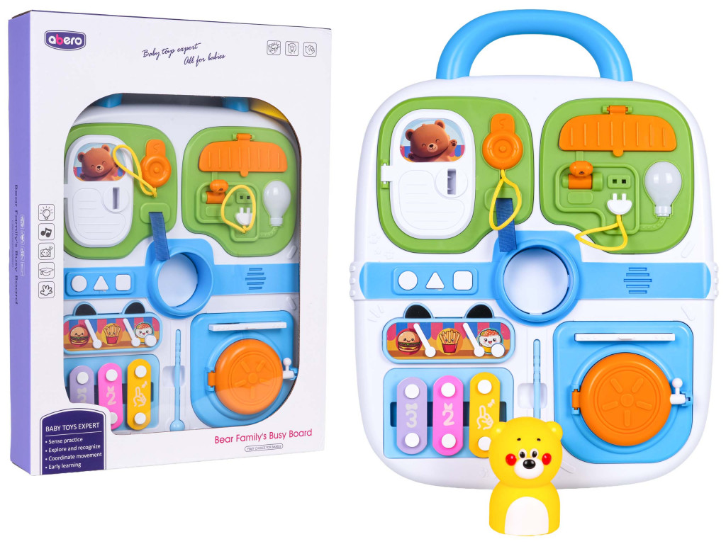 Többfunkciós, mozgatható bőrönd tizennyolc hónapos kortól kisgyermekek számára. A legkiválóbb minőségű, gyermekbiztos anyagokból készült, élénk színekkel díszített bőrönd olyan manipulatív elemekkel rendelkezik, amelyek fejlesztik a motoros koordinációt és támogatják a logikus gondolkodást. A bőrönd tetején hordozófogantyú található, míg az elején nyitó, csúsztató és nyomó funkciók, valamint mini cintányérok és egy pálca található. A játék 3 db AA 1,5 V-os elemmel működik (nem tartozék).