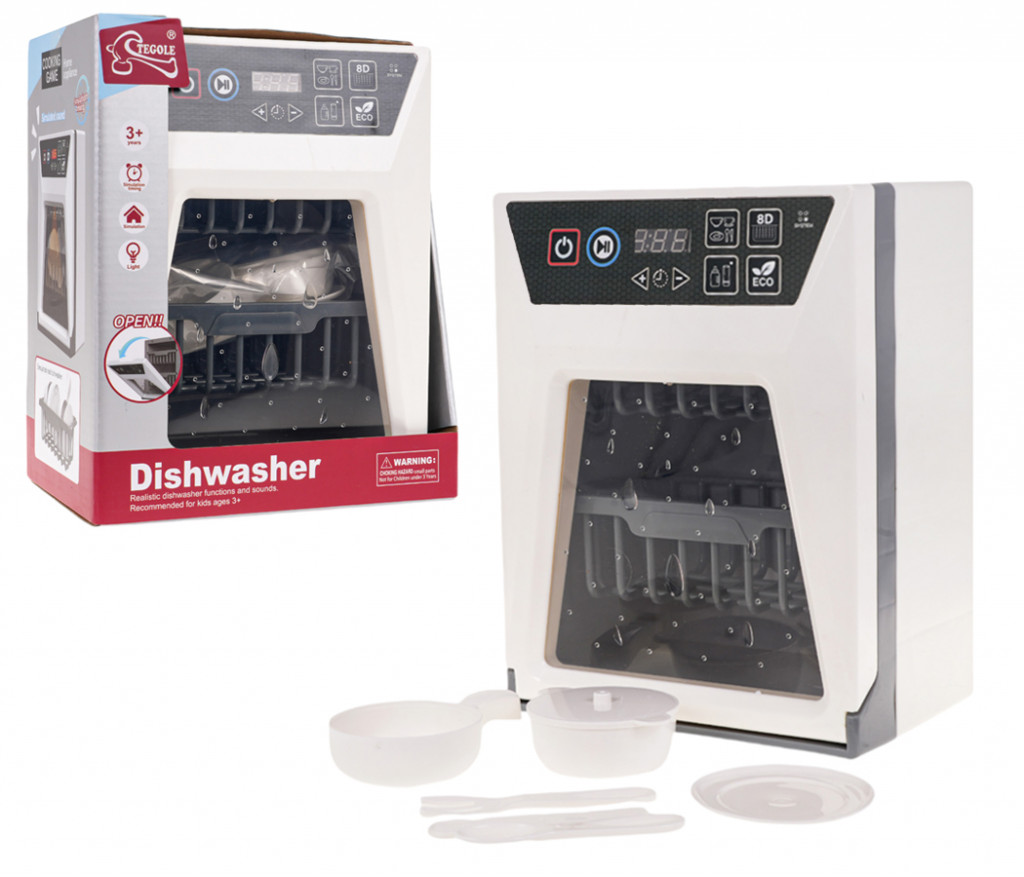 A mosogatógép úgy néz ki, mint egy igazi, és jellegzetes működési hangokat ad ki. A legjobb minőségű anyagokból készült és biztonságos a gyermek számára. A mosogatógép elindításához nyomja meg a piros gombot az érintőpanelen és válassza ki a programot, majd nyomja meg a lejátszás gombot. A mosogatógép a kiválasztott programra jellemző hangokat hallat, és visszaszámol a program végéig hátralévő időt. A mosogatógép ajtaja kinyílik, és az edényfiók belülről kivehető. A készlet számos edényt és evőeszközt tartalmaz.
