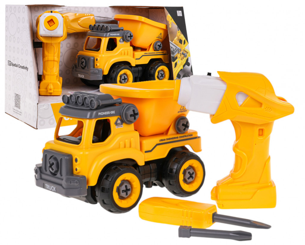 Interaktív építőipari jármű 3 éves kortól gyermekek számára, a készletben található tartozékokkal. A járművet összeszerelve és kompletten szállítjuk, a mellékelt csavarhúzóval vagy fúró-csavarozóval részeire szétszerelhető. A csavarhúzó kézi, míg a fúró-csavarozó elemes. A fúró levehető panellel rendelkezik, ha ezt a panelt áthelyezzük a járműre, akkor előre és hátra is irányíthatjuk. A panel segítségével a jármű önállóan előre vagy hátra is haladhat. Az építőipari jármű hangeffektusokkal is rendelkezik, például motor-, menet- és kürthangokkal, valamint mozgó elemekkel, például utánfutó vagy járműtető hangjelzésével. A játék a legjobb minőségű anyagokból készült, élénk színekben pompázik. A vezérlőpanelt 2 db AA 1,5 V-os elem (nem tartozék), az autót 3 db AG13-as elem (tartozék) működteti.