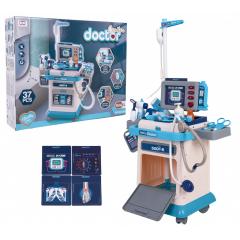 Interaktív, teljesen felszerelt orvosi készlet hang- és fényeffektekkel, három éves kortól gyermekek számára. A készlet egy masszív, könnyű, kerekeken guruló, kényelmes fogantyúval ellátott kocsiból és orvosi eszközökből áll. Röntgen- és CT-képek cserélhetők. A monitorozó képernyőn gombok megnyomásával aktiválható a szívverés, a pulzus vagy a CT-vizsgálat hangja, valamint egy riasztás. A szív gomb világít is. A monitorozó panelt 2 db AA 1,5 V-os elem táplálja (nem tartozék). A hőmérőt 2 db LR44-es elem táplálja (tartozék).