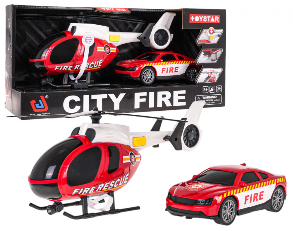 Interaktív tűzoltóság, helikopter és autó készlet 3 év feletti gyermekek számára. A készlet a legjobb minőségű műanyagból készült élénk színekben. A helikopter rendelkezik egy gombbal, amely aktiválja a fény- és hangfunkciókat. A gomb megnyomása aktiválja a helikopter első és hátsó lámpáit, valamint motorhangokat, riasztásokat és repülési hangokat. A helikopter 3 x AG13 akkumulátorral működik (tartozék). A tűzoltóautó gumiabroncsokkal és szabad kerékkel rendelkezik, amelyek megkönnyítik a szabad mozgatását a talajon. A helikopter légcsavarjai kézzel forgathatók.