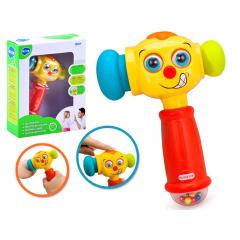 Vidám zenét játszik csak nyomjuk meg a fején a gombot,és a kalapács 5 vicces dallamot játszik.