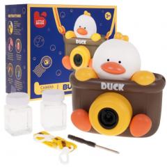 A kacsa formájú kamerára emlékeztető, interaktív szappanbuborékos gépet 3 éves kortól ajánljuk. A játék használata egyszerű, csak töltse fel a készletben található szappanbuborék-folyadékkal, és helyezze be az elemeket. A kacsa hasán egy fúvóka található, amelyből vidám dallamok kíséretében szappanbuborékok szabadulnak fel. A játék a fényképezés hangját is utánozza, mint egy igazi fényképezőgép. A géphez tartozik egy kényelmes pánt, amely lehetővé teszi, hogy a játékot a vállára helyezze. A játék 3 x AA 1,5 V-os elemmel működik, amelyeket a készlet nem tartalmaz.