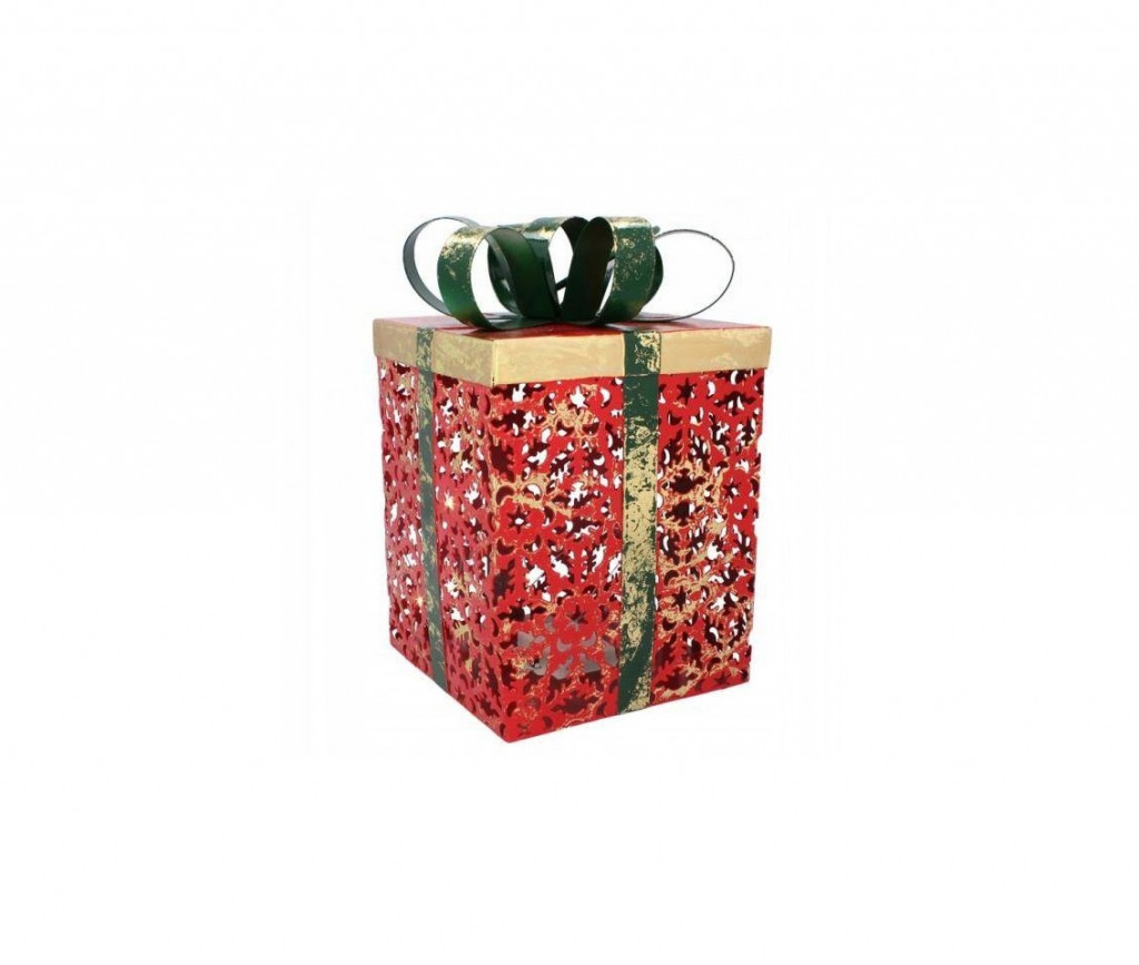 Karácsonyi ajándék, fém LED, piros, áttört, zöld masni, 16x26cm