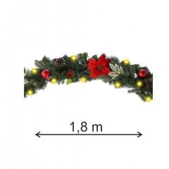 Varázsold ünnepivé otthonod ezzel a 180 cm hosszú karácsonyi girlanddal, amely gazdagon díszített piros és arany elemekkel, tobozokkal, bogyókkal és 20 darab meleg fényű LED izzóval. Ideális ajtók, ablakok, kandallók vagy asztalok díszítésére.